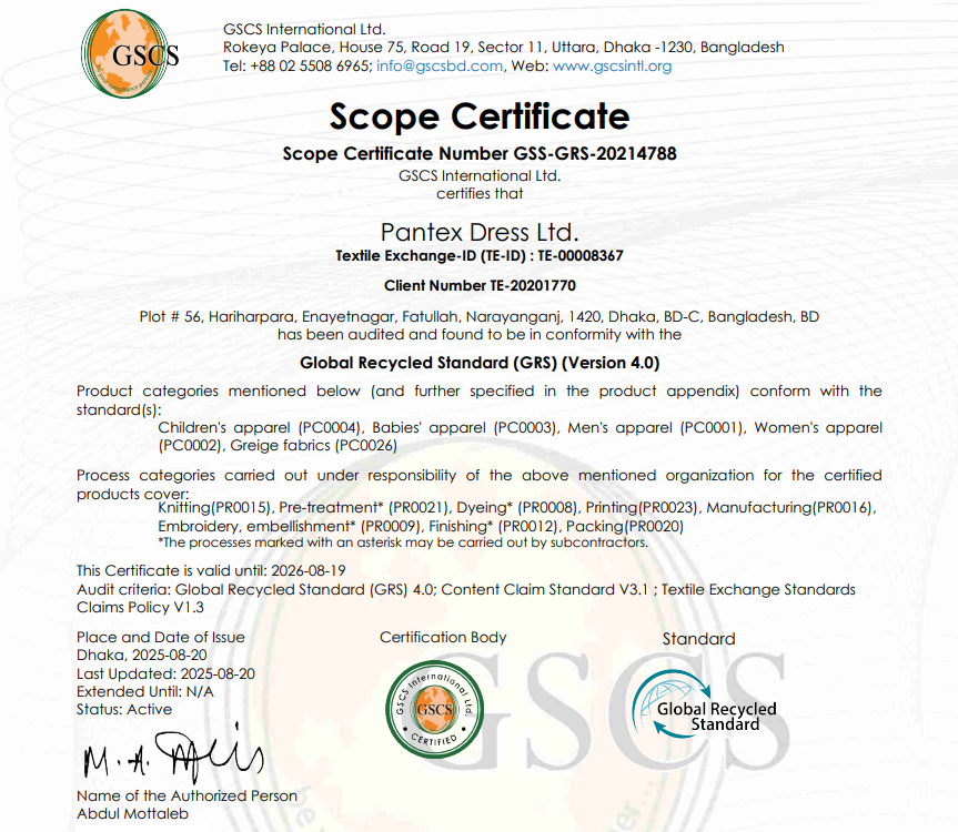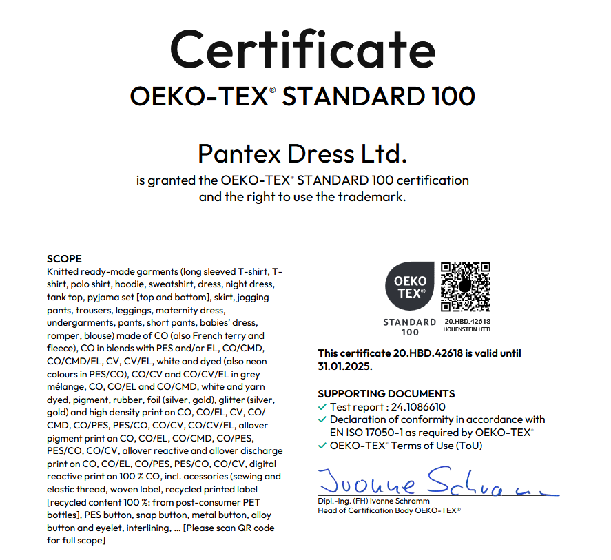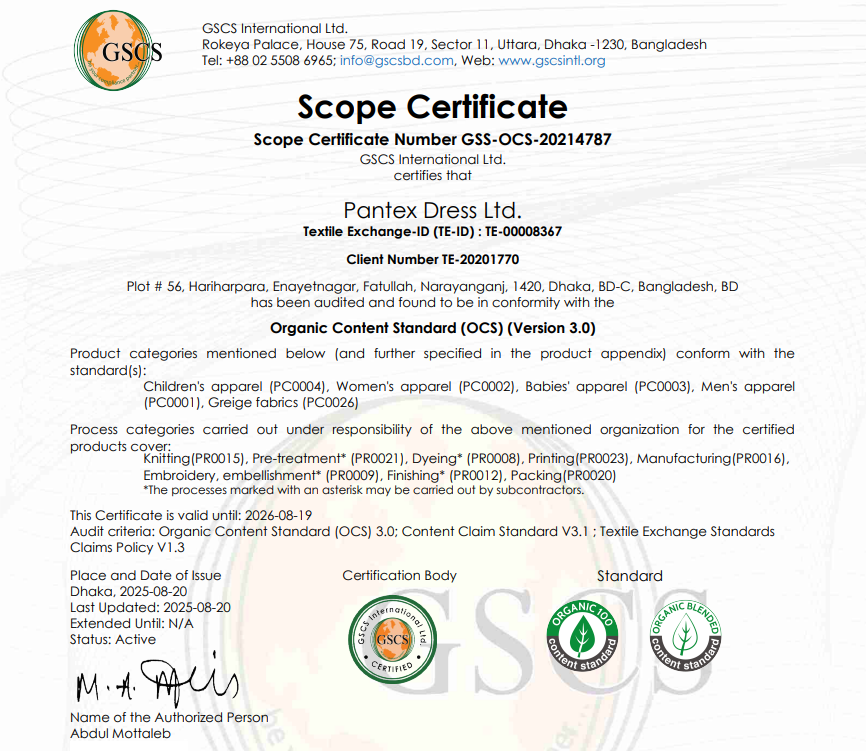 The Global Organic Textile Standard (GOTS) is one of the most comprehensive and respected certifications in the textile industry. This certificate ensures that our products meet stringent criteria for organic fiber content, environmental impact, and social responsibility. By achieving the GOTS certification, Pantex Dress Ltd. affirms our dedication to producing organic textiles while adhering to ethical and sustainable practices.